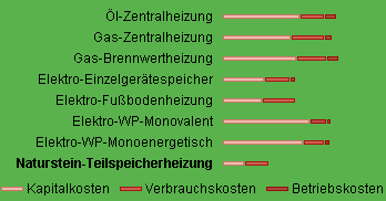 Großer Vorteil der Naturstein-Teilspeicherheizplatte im Kostenvergleich mit anderen Heizungssystem ist, dass die Kapitalkosten (kein Heizungsraum, kein Brennstofflager, kein Kamin, keine Rohr-Installation, etc.) gering sind und die Betriebskosten (Wartung, etc.) fast vollständig wegfallen. |