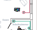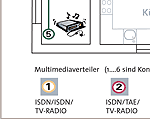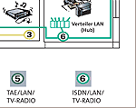 Die Zentrale des gesamten Homeway-Installation ist der Medienverteiler. Dort werden die Dienste, die in den einzelnen Räumen zur Verfügung stehen, verteilt. Die Verkablung zu den Anschlussdosen im Haus erfolgt mit dem HomeWay-Spezialkabel sternförmig. Dabei werden mehrere Dienste gleichzeitig über dieses eine Kabel übertragen. An den modularen Anschlussdosen werden die gewünschten Dienste schließlich entnommen. |